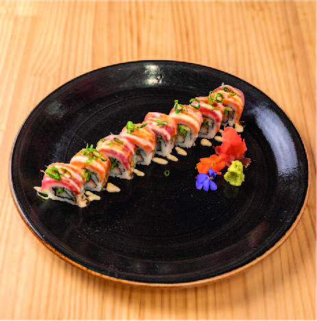 Crab meat, cucumber, avocado, salmon and tuna on top with lemon sauce and sushi teri (8pcs)