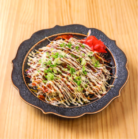 Savory pancake dish consisting of wheat flour batter, cabbage, meat, and seafood, topped with okonomiyaki sauce, dried seaweed flakes, Japanese mayonnaise, and pickled ginger