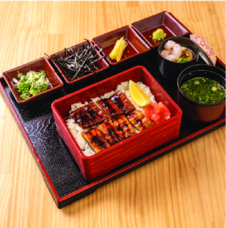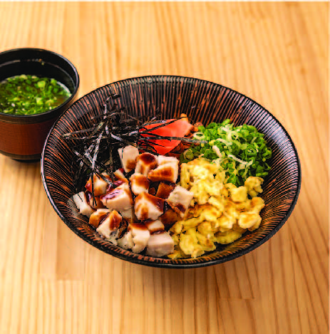 Rice bowl dish topped with grilled eel fillet, soft-boiled egg and vegetables