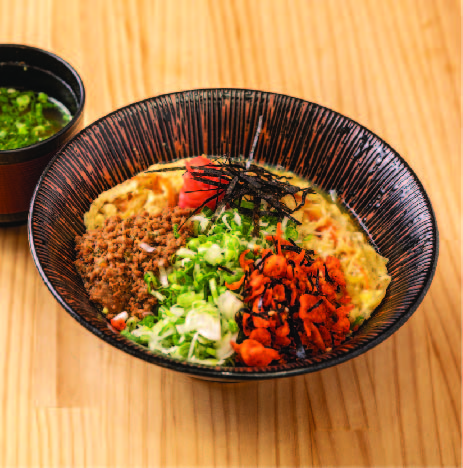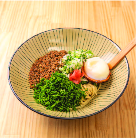 Thick, chewy noodles are mixed with well-seasoned minced beef, garlic chives, green onion, nori, leek, and egg yolk