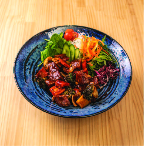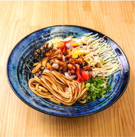Stir-fried udon noodles with shredded meat, julienned vegetables, soy sauce, and mirin topped with mayonnaise and seaweed. Select between beef, chicken, or shrimp