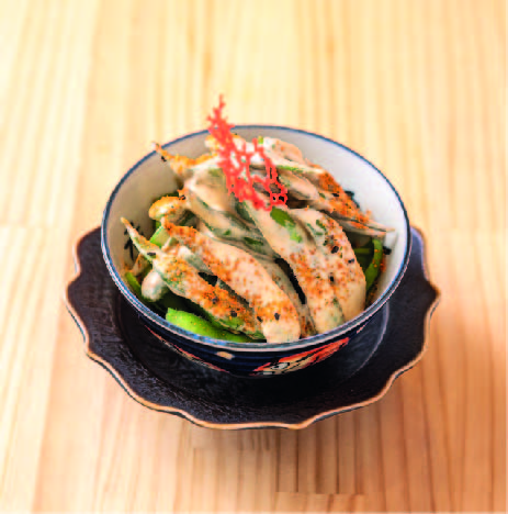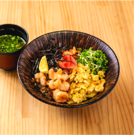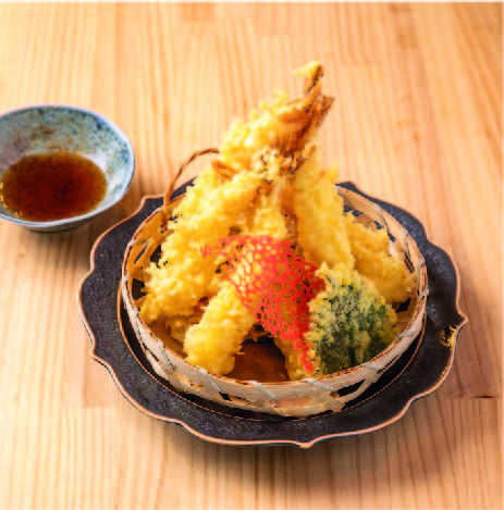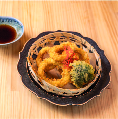Shrimp, cuttlefish and vegetables coated in a thin batter and fried until lightly crisp, and served with a IROIRO style salt and dandashi soy sauce