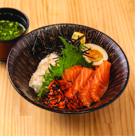 Rice bowl dish topped with raw salmon, soft-boiled egg and vegetables