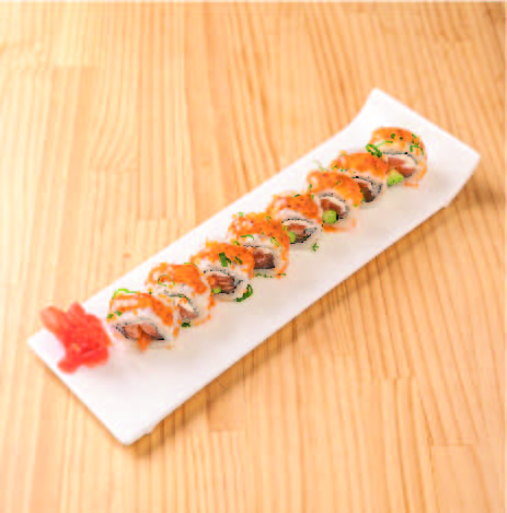Crab meat, avocado, and cucumber, topped with spicy sriracha, mayonnaise and tobiko (8 pcs)