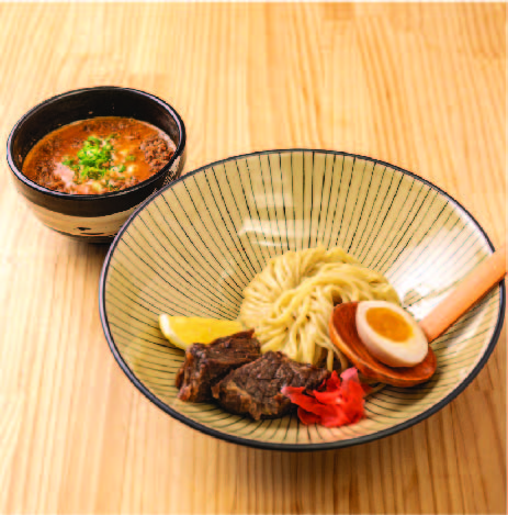 Separate soup for dipping made with beef stock, beef meat, ground beef, miso, minced vegetables, and chili