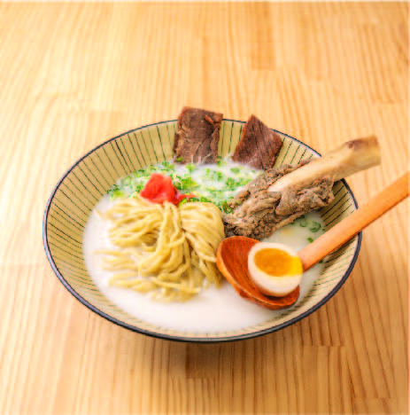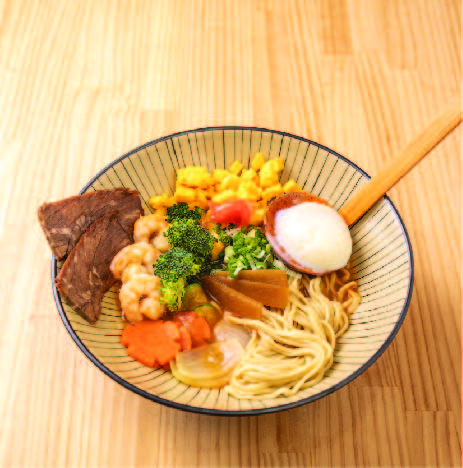 Ramen noodles cooked in a creamy cheesy sauce chicken stock with runny egg, green onions, garlic, shrimp and beef slice