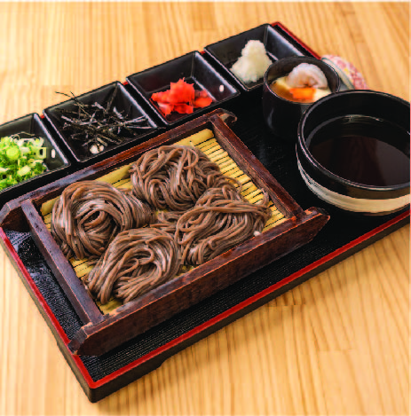 Cold noodle with soy sauce, green onion, ground radish, nori and wasabi