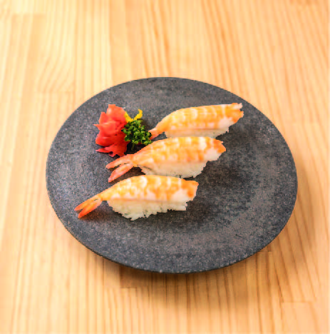 Consists of hand-pressed sushi rice topped with thin wasabi coated shrimp (3 pcs)